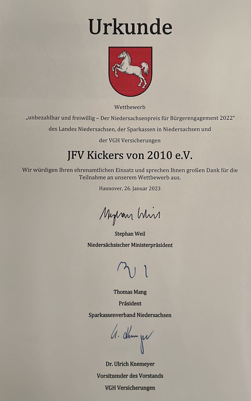 Der JFV Kickers wurde für seinen ehrenamtlichen Einsatz beim Niedersachsenpreis für Bürgerengagement 2022 des Landes Niedersachsen, der Sparkassen in Niedersachsen und der VGH Versicherung ausgezeichnet.