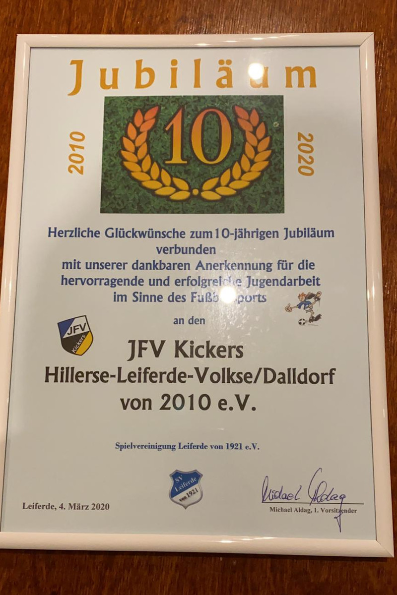 Dabei erhielten wir von der SV Leiferde eine Ehrung für unser 10 jähriges Jubiläum und für unsere hervorragende Jugendarbeit, die wir seit unserer Gründung im Sinne des Jugendfußballs immer wieder erbringen.