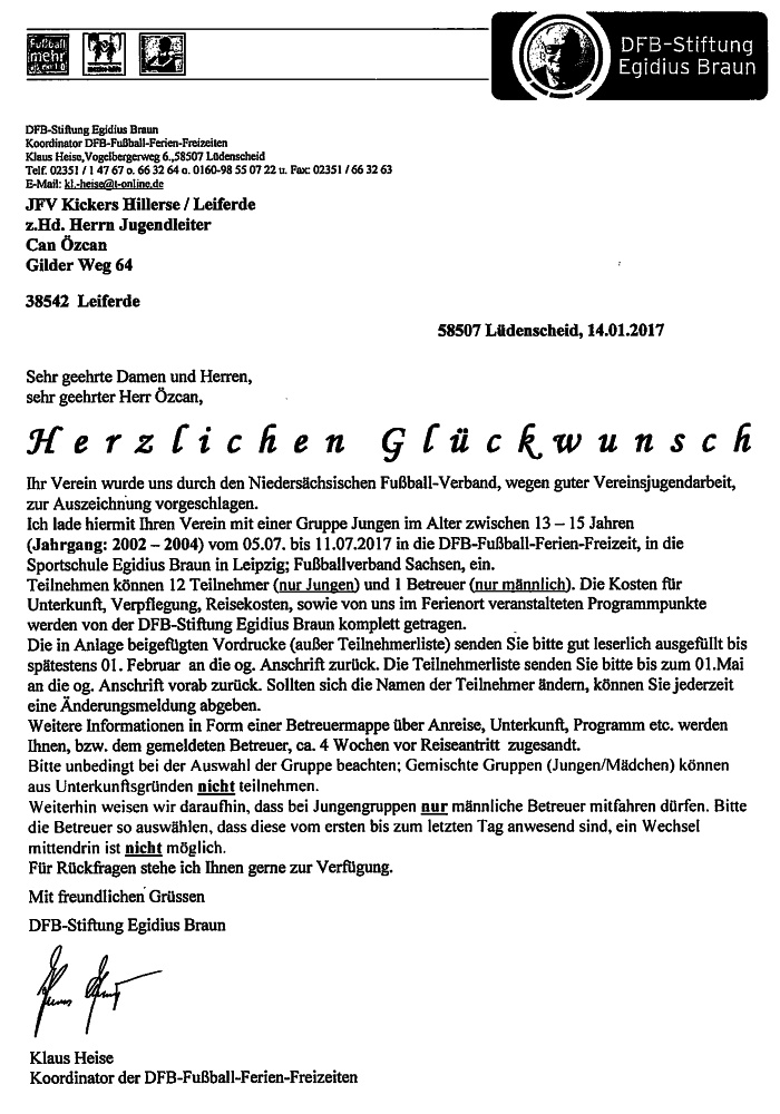 Mit Ihrer Bewerbung haben Sie sich die Mühe gemacht, uns die Jugendarbeit Ihres Vereins vorzustellen und wir freuen uns Ihnen mitzuteilen, dass Ihr Verein von der DFB-Stiftung Egidius Braun und dem Verbandsjugendausschuss des NFV ausgezeichnet wird. Sie können sich somit über eine Fußball-Ferien-Freizeit in den Sommerferien für 12 Kinder (Jahrgänge 2002-2004) und einem Betreuer in der Sportschule Leipzig (4x 11.7.-17.7. sowie 1x 17.7. - 23.7.2017) bzw. der Sportschule Grünberg (4x 15.7.-21.7.2017) freuen!